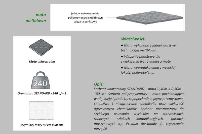 Sorbent uniwersalny niegładzony- mata 0,40m x 0,50m - 25 szt. w poręcznej torbie PCV. Sorbent polipropylenowy – mata pochłaniająca wodę, oleje i produkty ropopochodne, płyny przemysłowe, chłodziwa i nieagresywne chemikalia oraz większość agresywnych chemikaliów. Sorbent przeznaczony do szybkiego usuwania wycieków na stanowiskach roboczych, szlakach komunikacyjnych, parkach maszynowych itp. Sorbent w matach to również doskonała alternatywa dla zwykłego czyściwa. Mata wykonana w technologii MeltBlown.